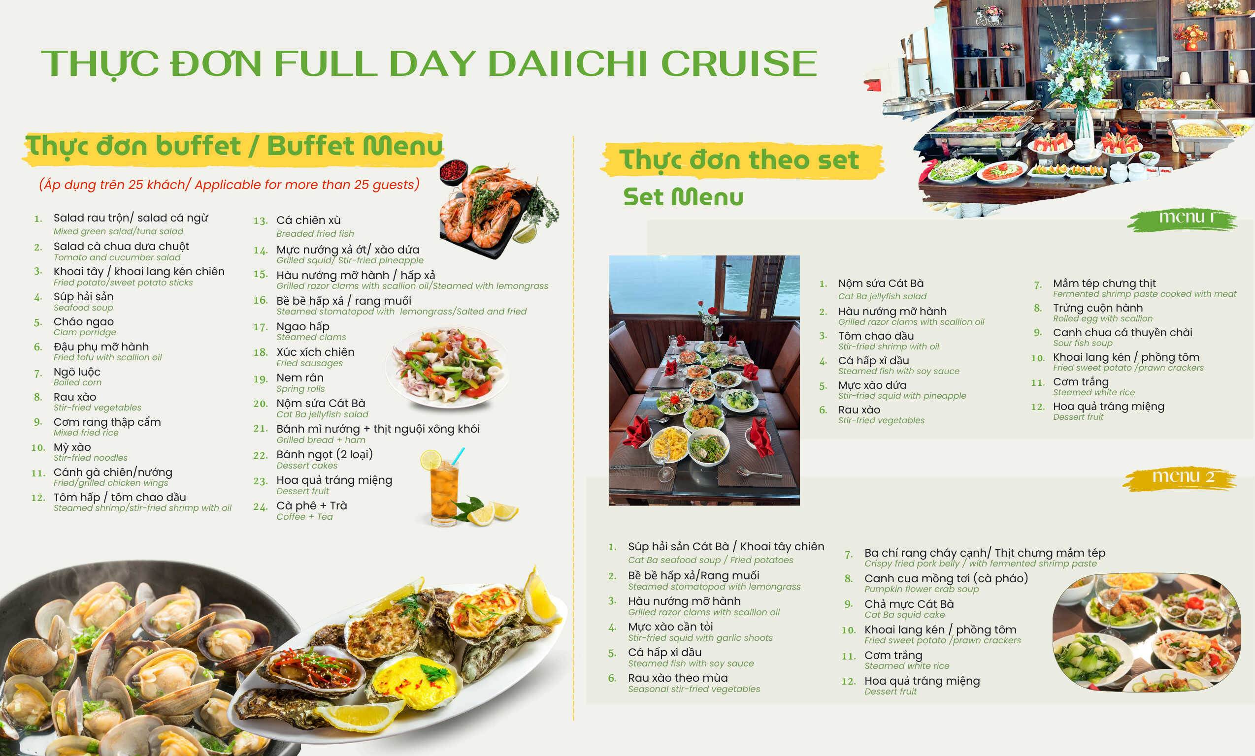 11.30 am - 12.30 pm: Return to Daiichi Cruise to enjoy lunch. The Lan Ha Bay 1-day tour includes a seafood lunch with a diverse menu, either buffet style or set menu.