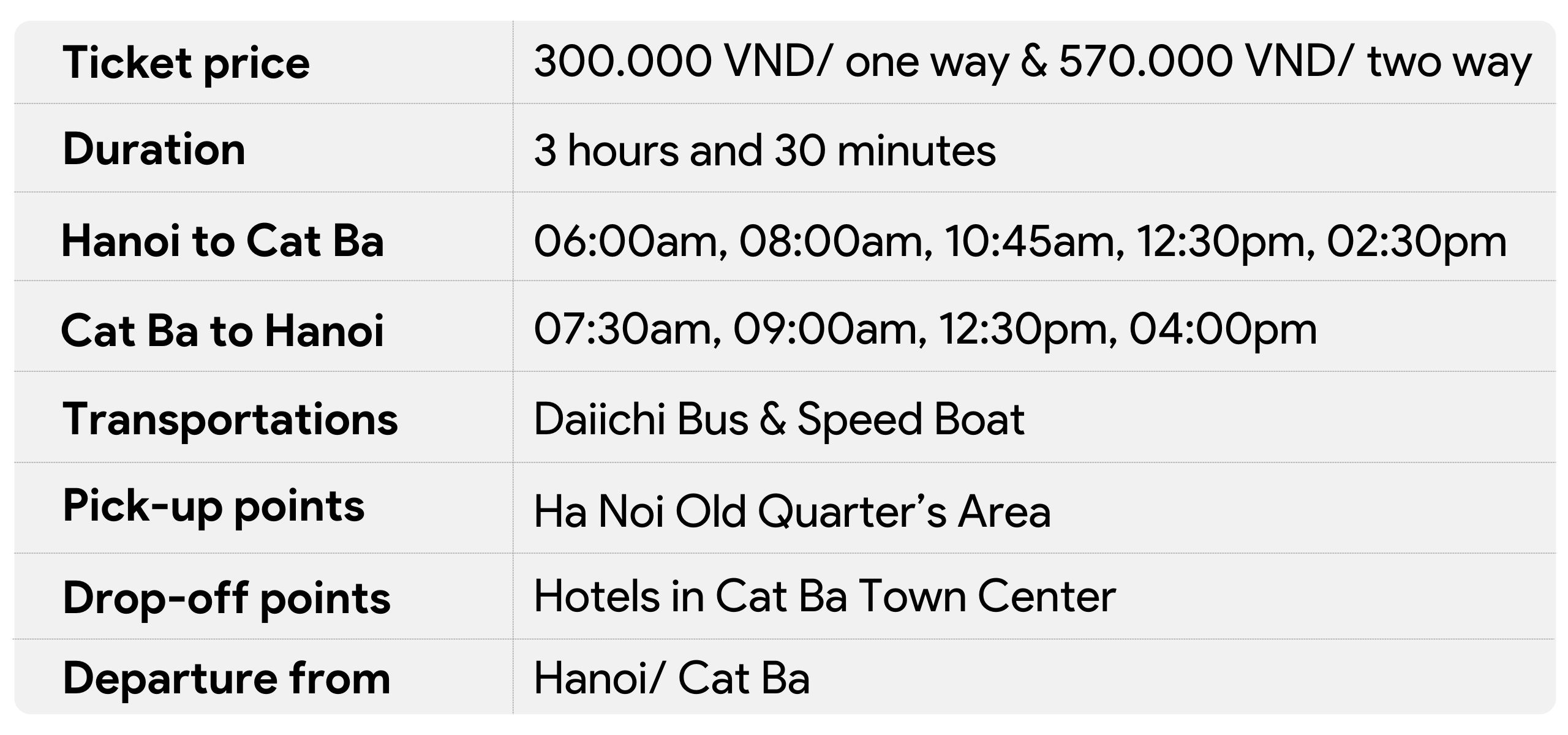 + Hanoi => Cat Ba (vehicles passing by ferry) depart: 8:00 and 12:30