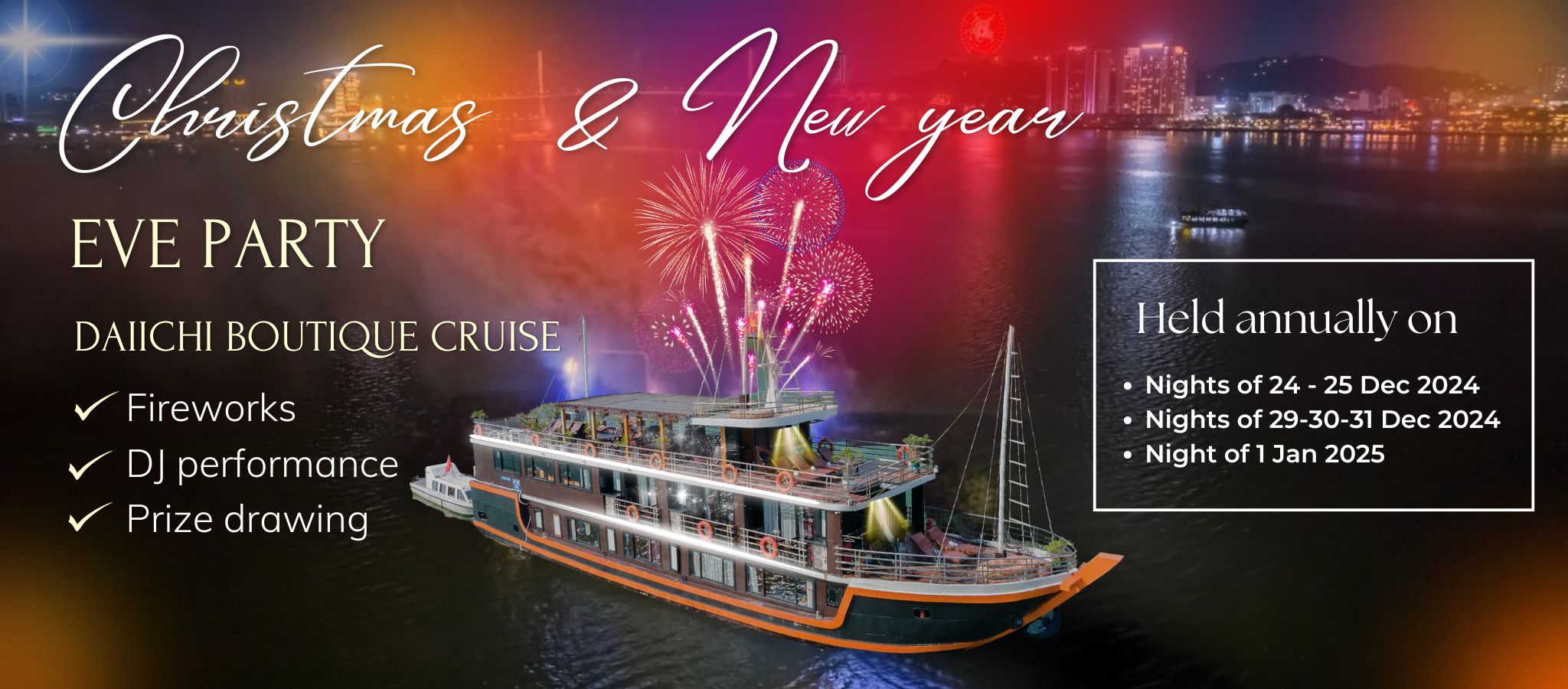 Especially, on Christmas Eve (December 24) and New Year's Eve (December 31), we organize a fireworks display on the cruise to celebrate and welcome the beautiful moment of the New Year transition together.