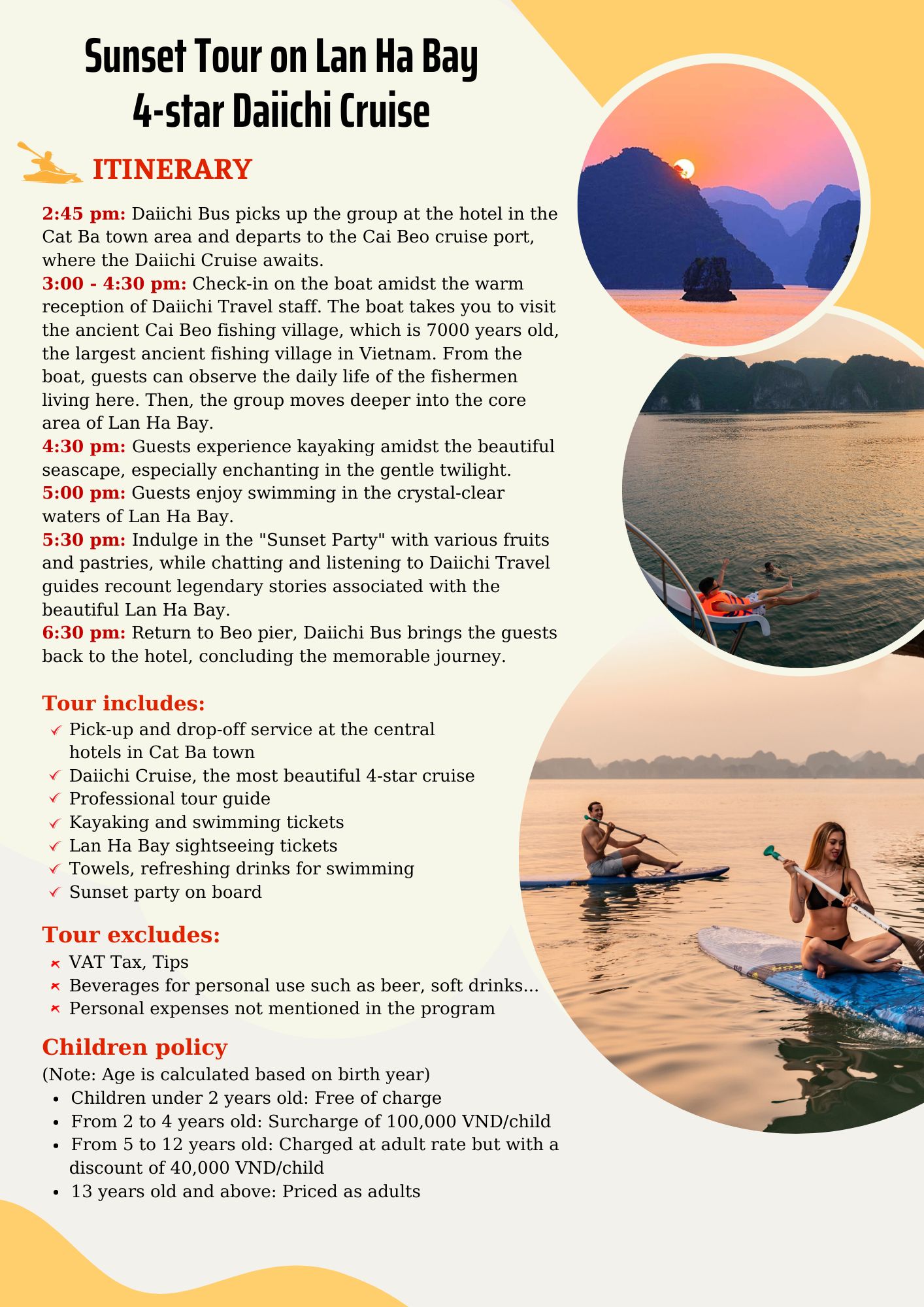 Experience the beauty of Lan Ha Bay during a romantic sunset cruise with our special combo. Enjoy professional services and amenities including round-trip transportation from Hanoi to Cat Ba by high-speed boat, avoiding ferry congestion, along with sweet treats and bottled water on the bus, and a half-day tour to admire the stunning sunset over Lan Ha Bay.