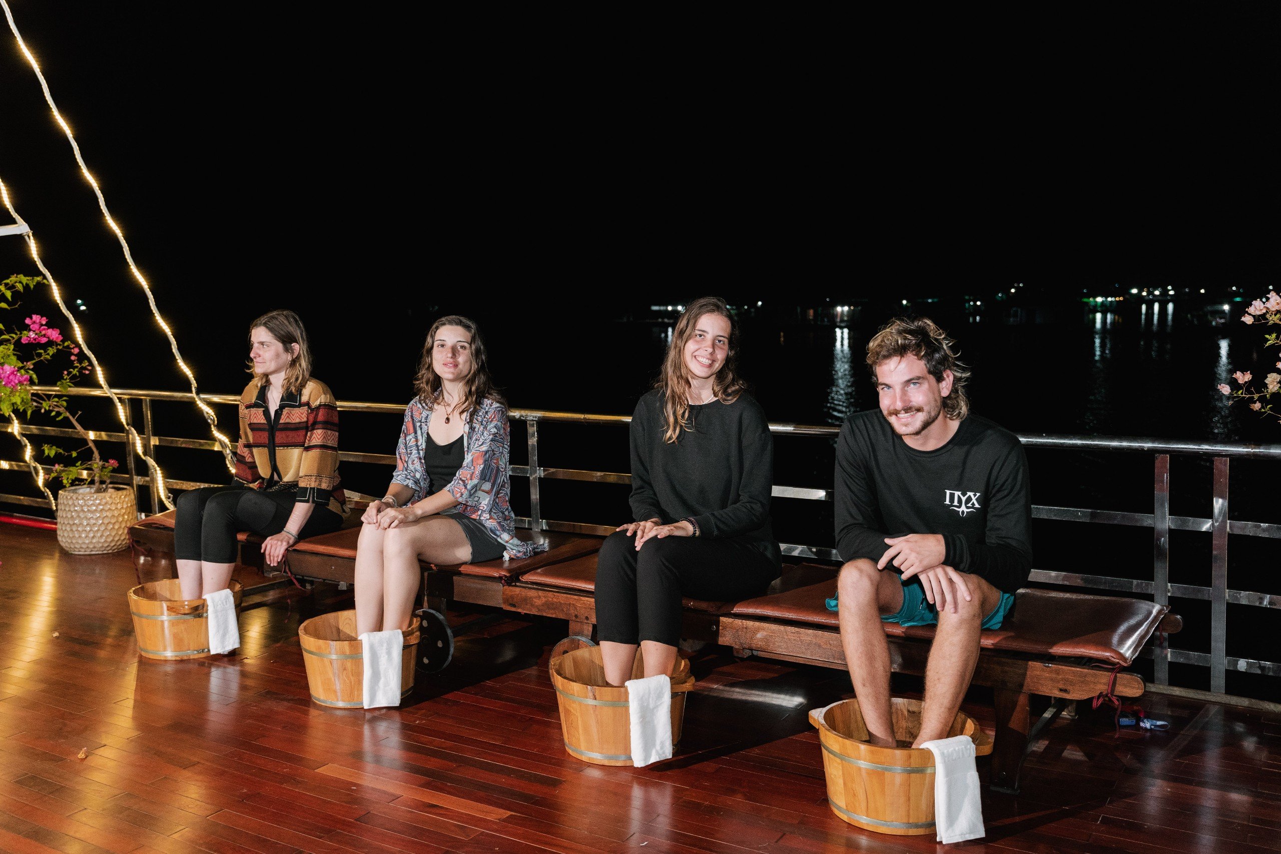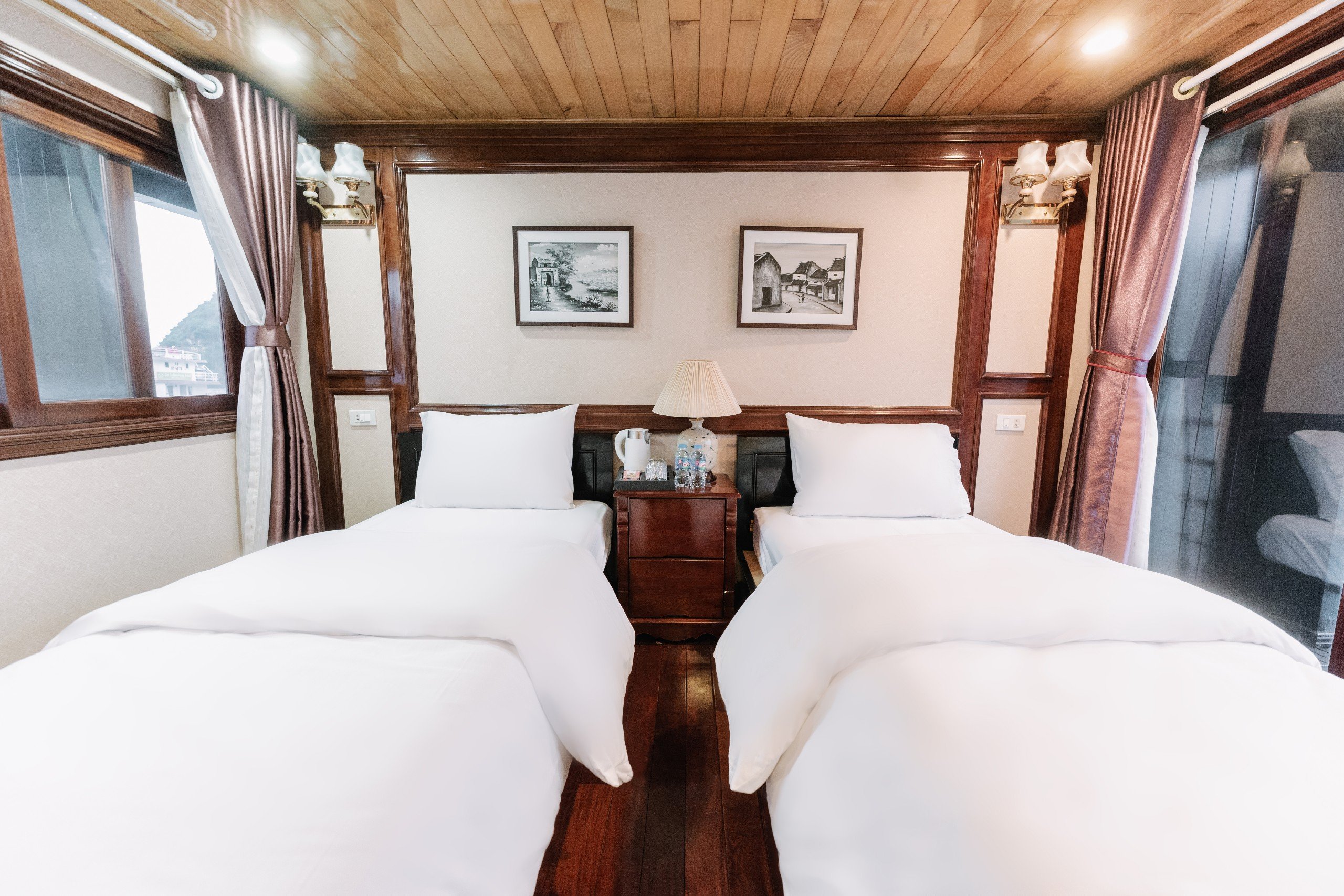 Moreover, on these overnight cruises, guests can relax in rooms designed in an Indochinese style, featuring warm wooden tones amidst gentle waters and the endless sky. Waking up to the fresh sea air in the early morning will undoubtedly create unforgettable moments.