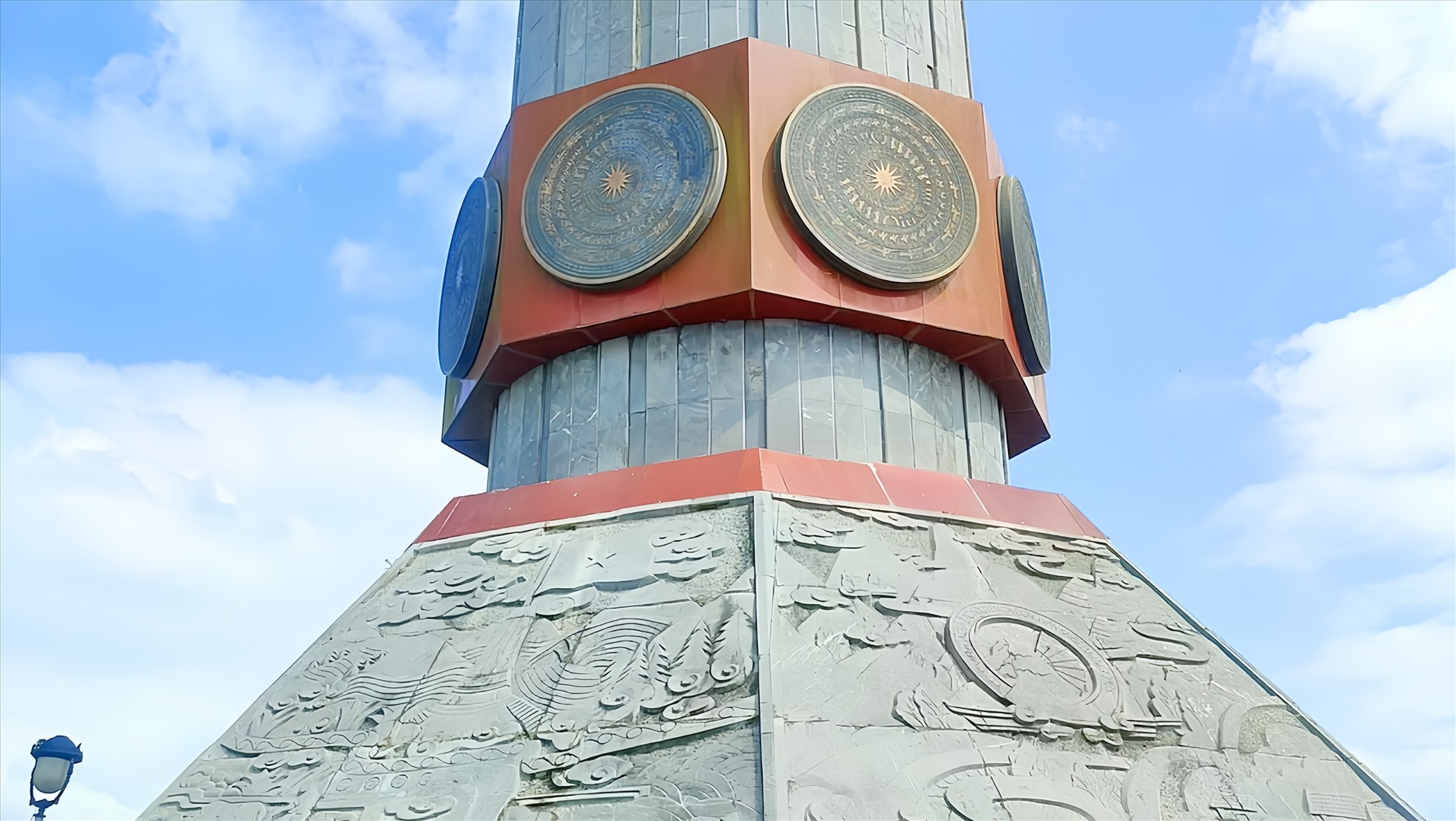 The current Lung Cu Flagpole has an octagonal design, 33.15 meters high, with a base height of 20.25 meters and a column diameter of 3.8 meters. At the foot of the flagpole, eight stone reliefs depict the historical stages and traditional customs of the Ha Giang people. Above are eight Dong Son bronze drum faces, a distinctive symbol of Vietnamese culture.