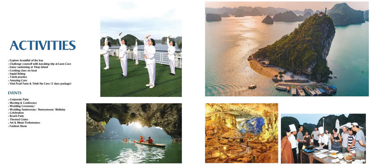 | Activities | Kayaking, swimming, sunset party, cooking class (make spring rolls), spa, Taiichi session, squid fishing. |