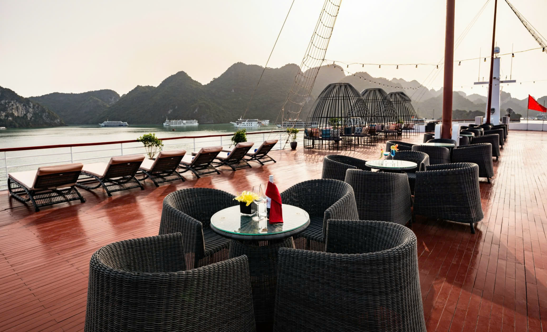 17:00: Free time to relax on the cruise. Don't miss the sundeck area to catch the sunset, enjoy the sunset party and take part in a cooking class of authentic Vietnamese dishes.