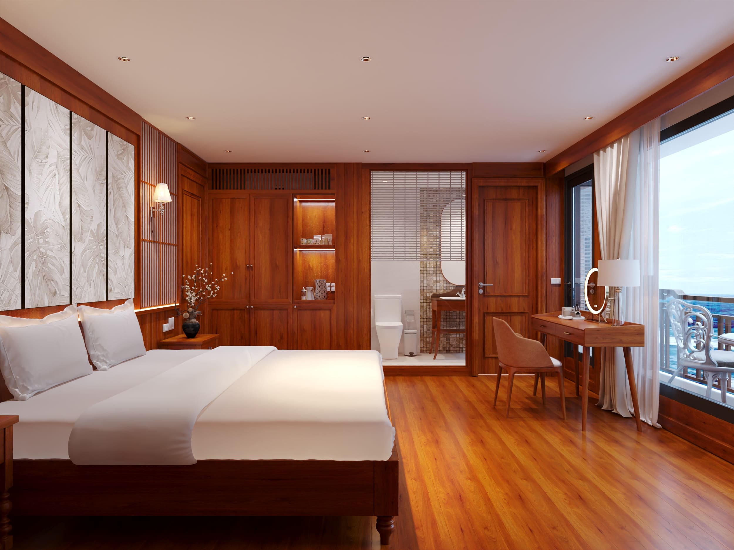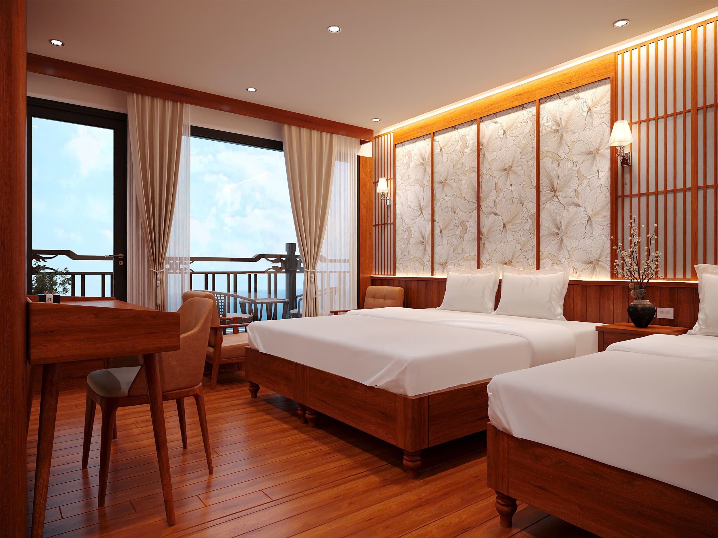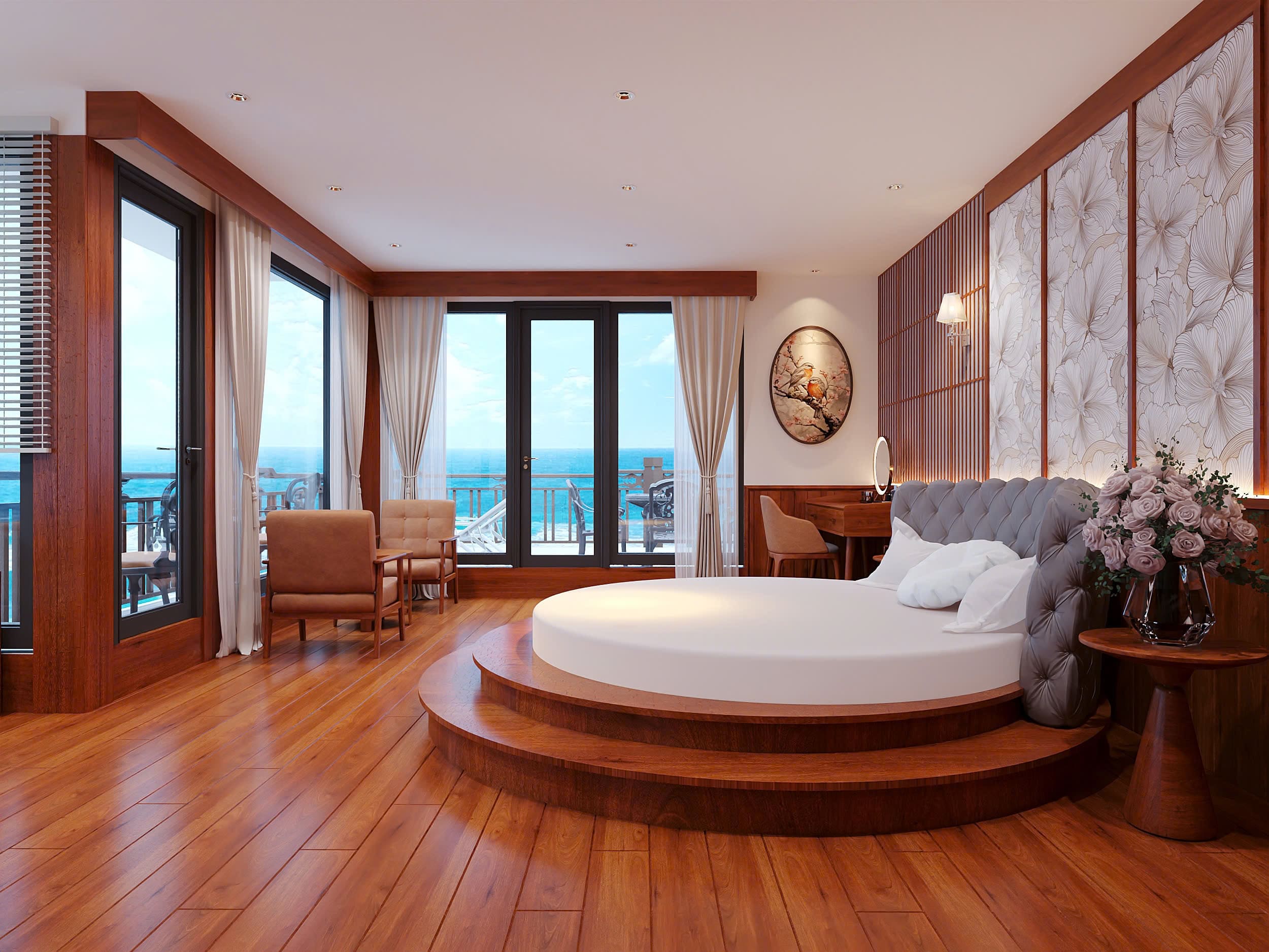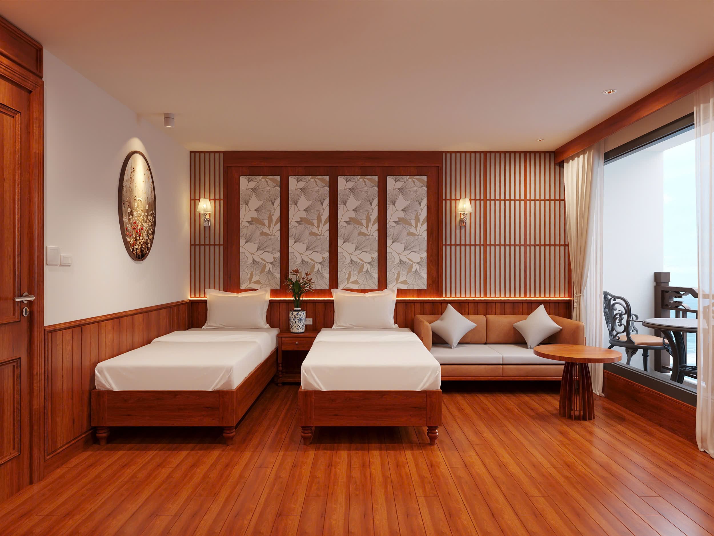 The Senior Suite is a luxurious room located on the second deck of the cruise ship, offering stunning sea views and a private balcony, perfect for couples on vacation. The suite is equipped with many luxurious amenities: a king-size bed, a coffee table and sofa, a dressing table, a two-way air conditioner and bathtub, shower.