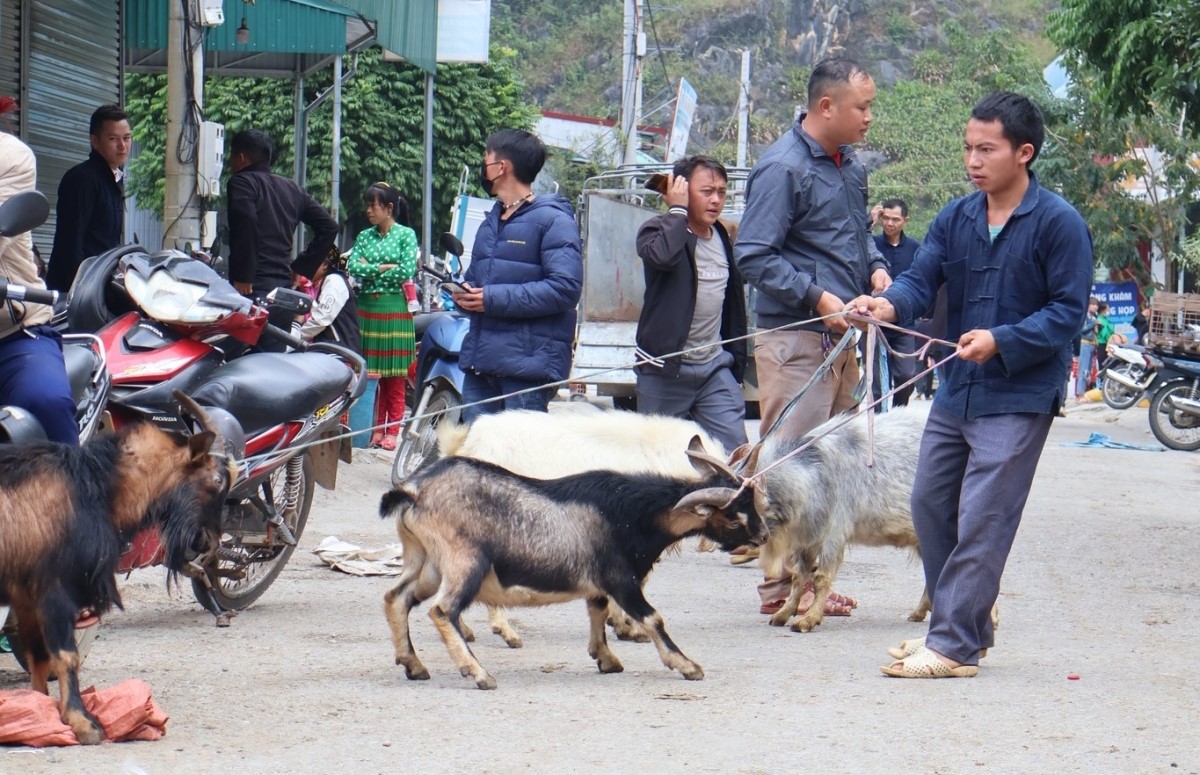 The livestock and poultry section of Meo Vac market is very unique. Unlike markets in the lowlands, animals like dogs, pigs, chickens... are not kept in cages but carried under the arm or led by ropes. Buffalos and cows often wear a bell around their necks and stand waiting for buyers.